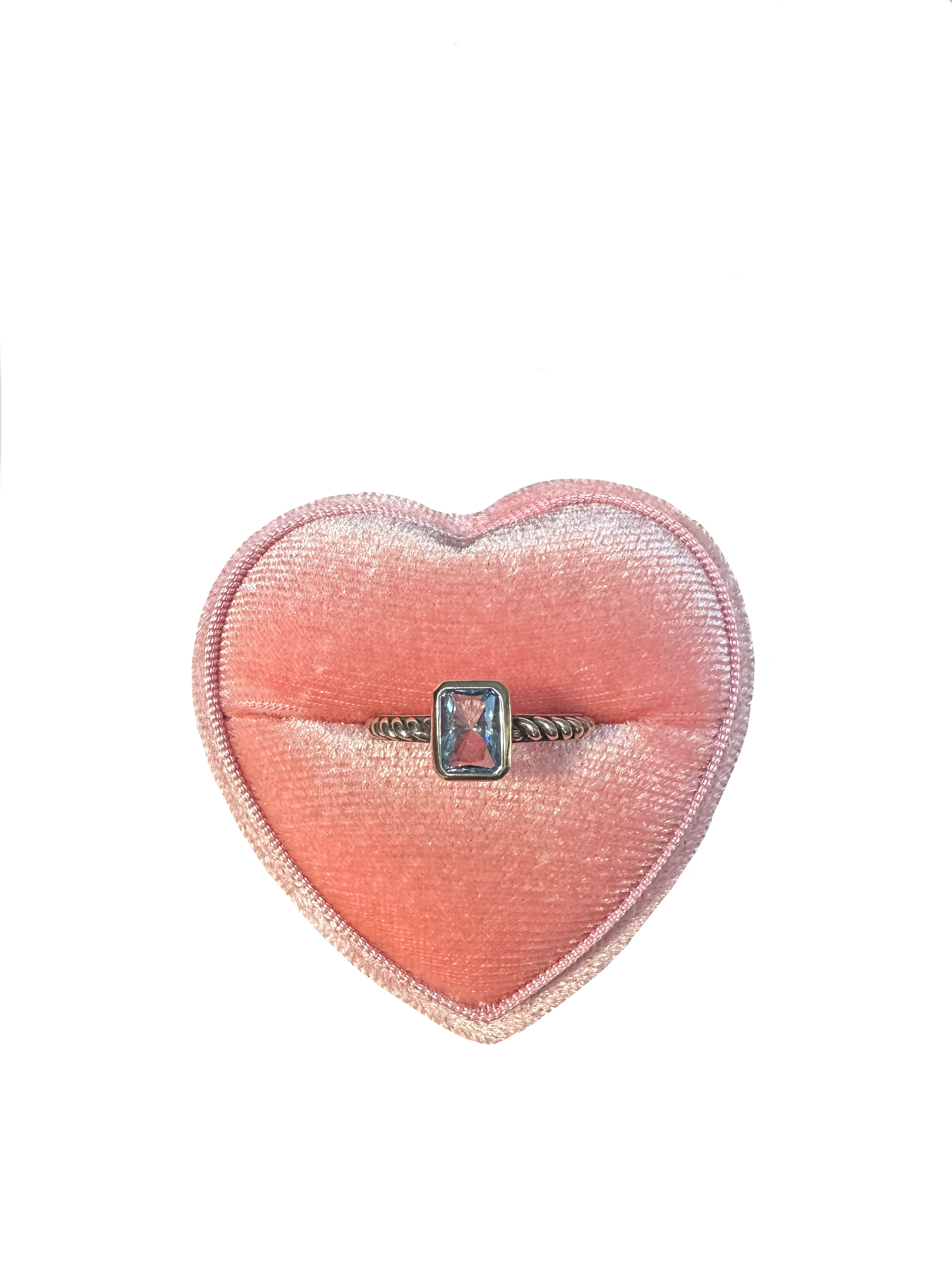 The Aqua Ring features a sparkling emerald-cut zircon in a soft aquamarine shade, set on a twisted cord-style sterling silver band. The combination of clean lines and textured detail gives it a modern yet playful feel.
